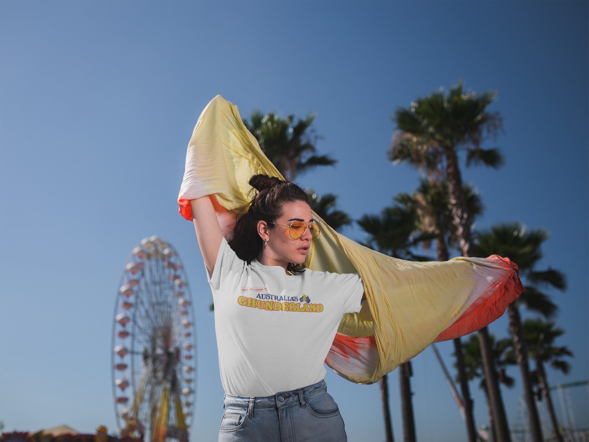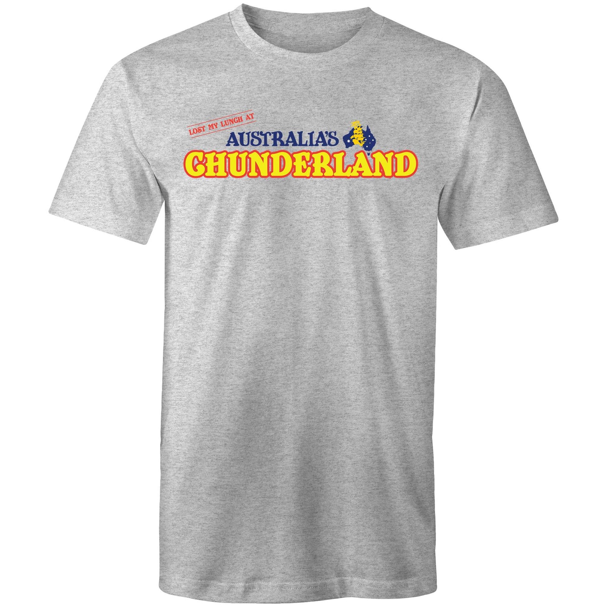 This tee features the text 'Lost My Lunch At Aus Chunderland' in a Wonderland style logo. Put your hands in the air and try not to scream as you head to the shopping cart.
